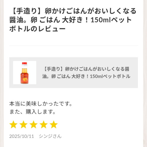 オンラインショップの「卵かけごはんがおいしくなる醬油。」に、シンジ様から温かいレビューをいただきました。ありがとうございます!「本当に美味しかったです。また...