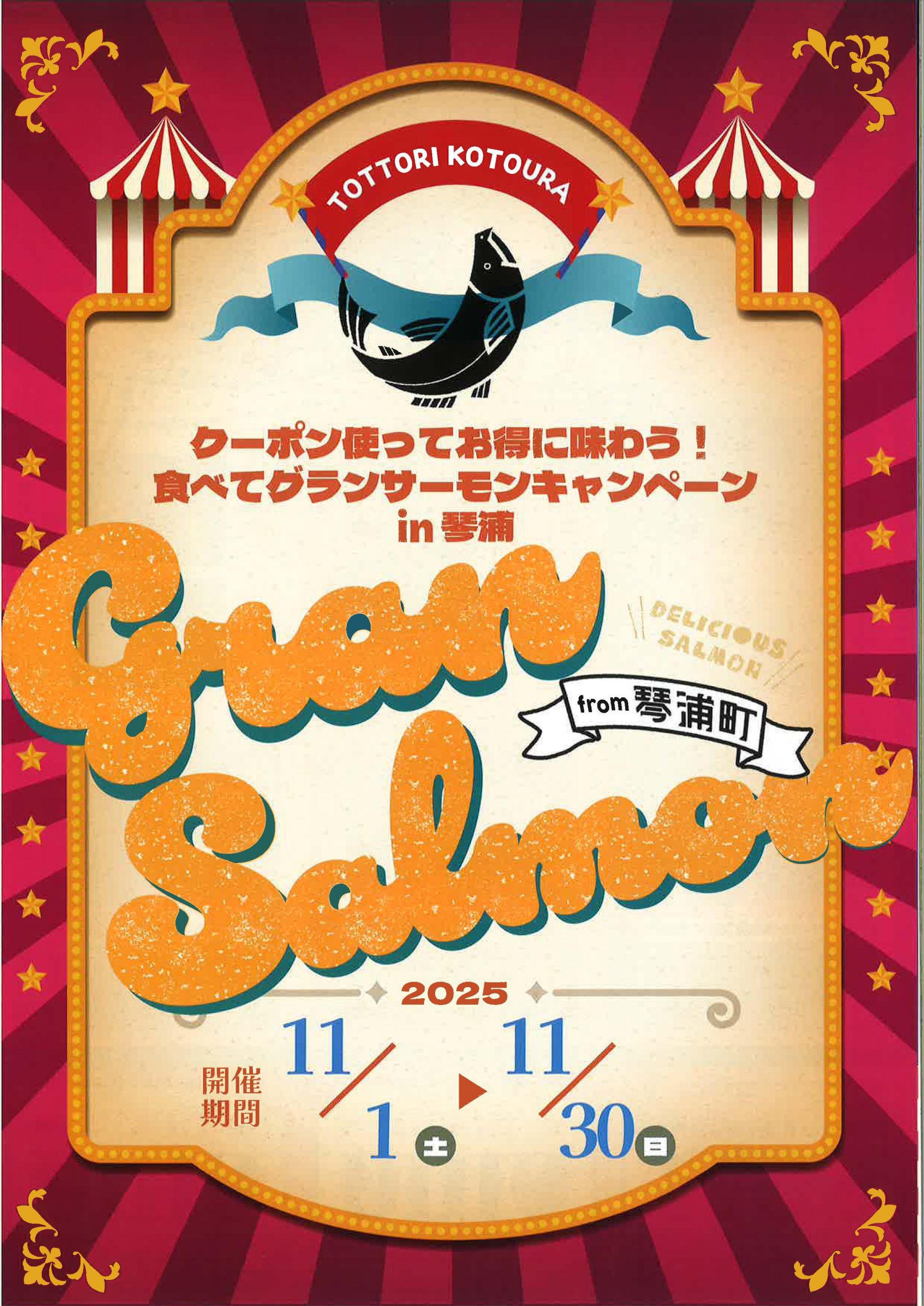 11月1日から30日までの1か月間、琴浦町内の飲食店で「グランサーモン」をお得に味わえるキャンペーンが開催中です! 町内各地に、クーポン付きのチラシが設置されていま...